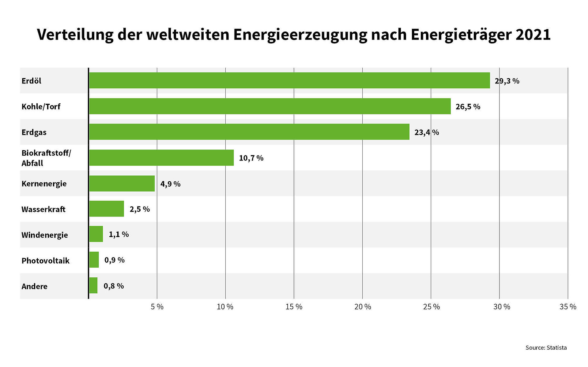 Klimaneutrale Energieerzeugung ist eine der größten Herausforderungen unserer Zeit. Die globale Verteilung der Energiegewinnung nach Energieträgern für das Jahr 2021* zeigt, dass fossile Brennstoffe noch immer den größten Anteil ausmachen. Erneuerbare Energien sind jedoch zunehmend auf dem Vormarsch. Da der Energiebedarf bis 2050 erwartungsgemäß weiter ansteigen wird, hat der Ausbau erneuerbarer Energien höchste Priorität. Aus diesem Grund konzentrieren sich weltweit viele Forschende darauf, neue und effiziente Möglichkeiten zur klimaneutralen Energieerzeugung zu finden.